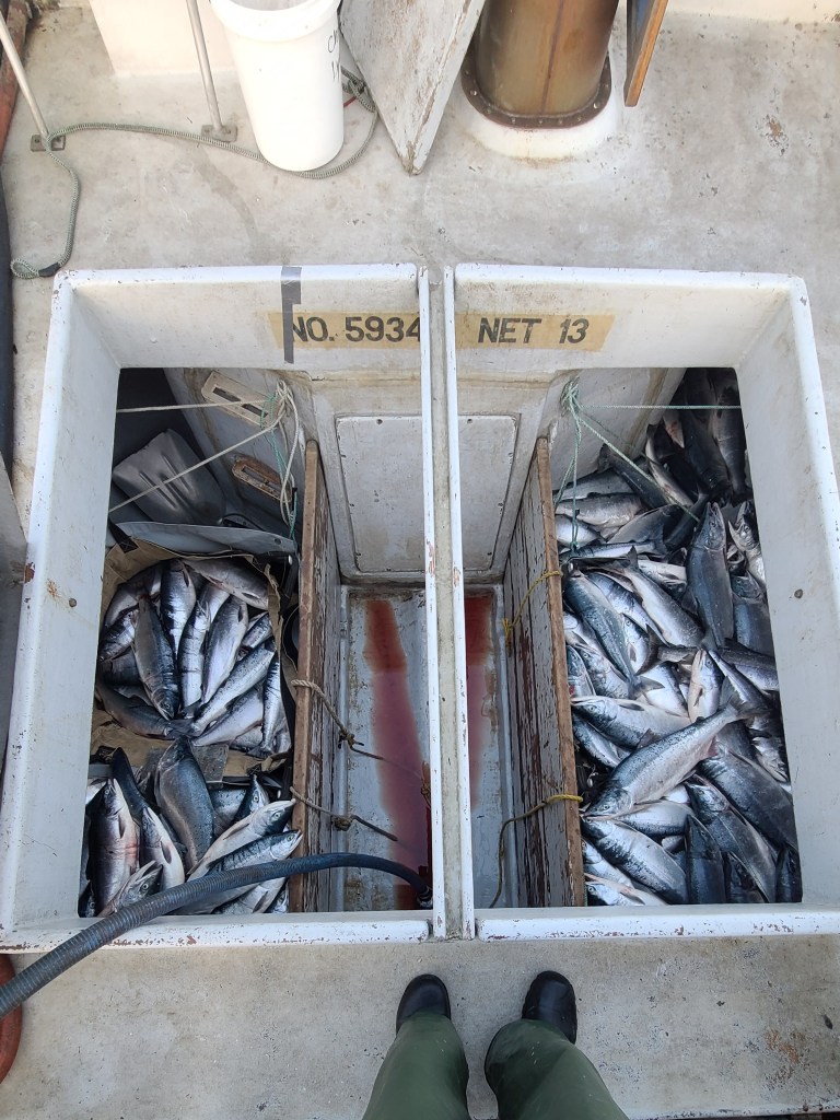 After a few hours of nonstop fishing, we were starting to get pretty tired. Seeing our fishing holds fill with salmon gave us an invigorating rush to keep going though! Eventually we ran out of space below deck so we had to bring out deck bags, which were soon filled. The fish kept coming and soon the entire deck was covered in a couple layers of fish. As the boat would wallow in the wave troughs, all the catch would roll from one side of the boat to the other. It was astonishing seeing such a massive haul. When the period was over, we made our way over to our tender to offload, and we had caught around 10,000 lbs. of reds. What a good day! If we had 20 periods like that, we’d be making good money at the end of the season.