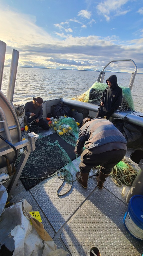 The skipper had heard that there were lots of fish moving upriver, so we found a spot in about four feet of water and deployed our net. After letting the net soak for a bit, we pulled it in to find quite a few fish. They were on the small side for the most part however. There also was a bunch of sticks, mud and decaying salmon carcasses in the net due to fishing so shallow. As the net came up over the roller it sprayed all that garbage right in your face. Every set was like this fishing in the shallows. We spent that day and the next few days grinding out fish in the river. We would leave the net out for 2-3 hours at a time and let it soak up fish. It was probably the least exciting fishing we had done up to that point. The weather was really nasty during this period, the wind was relentless and would chill you to the bone on deck. You just couldn’t get warm no matter what you did.