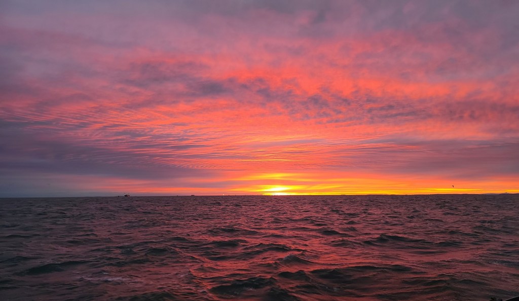 The captain of the Notorious was a super nice guy. He offered the use of his galley, showers and laundry room to us. We didn’t take him up on any of these things, but we did explore all over the vessel. As we had been at sea for a week, it was nice to walk on a steady deck. I was really impressed by how clean and shipshape everything was. The crew was a bunch of young green guys, but they seemed to be taking care of their vessel. It was a really cool experience being on my first crab boat. It would have been nice to experience it without the breakdown though! Eventually we got to a point where the captain of the Notorious felt it would be better if we were towed behind his boat. They tossed down a huge towing rope, and we attached it to our bridle up front. Soon, we were back under way. Someone needed to be watching the rope at all times, so we each took a 2 hour watch to do so. I was lucky enough to get the dawn watch, and to witness the most groovy sunrise of the whole season.