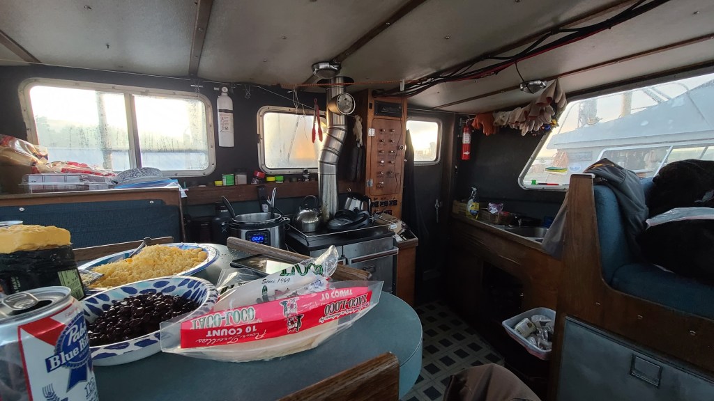 Everyone on the boat had a specialized task, and I was assigned to taking care of all things related to cooking and food. Our main way to prepare food was through an Insta-Pot. The finished product we referred to as ‘boat slop’. Boat slop usually consisted of a pasta combined with a sauce, vegetables and meat. Taylor had stocked us with a whole bunch of moose meat, processed in different ways from a kill he made the previous winter. There were roasts, breakfast & link sausage, pastrami, Slim-Jims, ground meat, and T-bone steaks for us to incorporate into our meals. It was delicious however we had it! We also had a small butane stove for things that required cooking with a degree of control, such as salmon fillets. Our groceries were shipped into the boatyard via barge inside a couple of big storage containers. I was assigned the task of splitting everything into several boxes that would be stored there at the cannery. Then, as they were needed, the tender boats would bring them out to us. I organized dry boxes, drink boxes and frozen boxes by number and recorded the contents on a list. That way, if we needed a specific item I could request the box that it was in. It was a pretty good system.