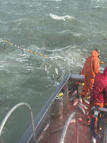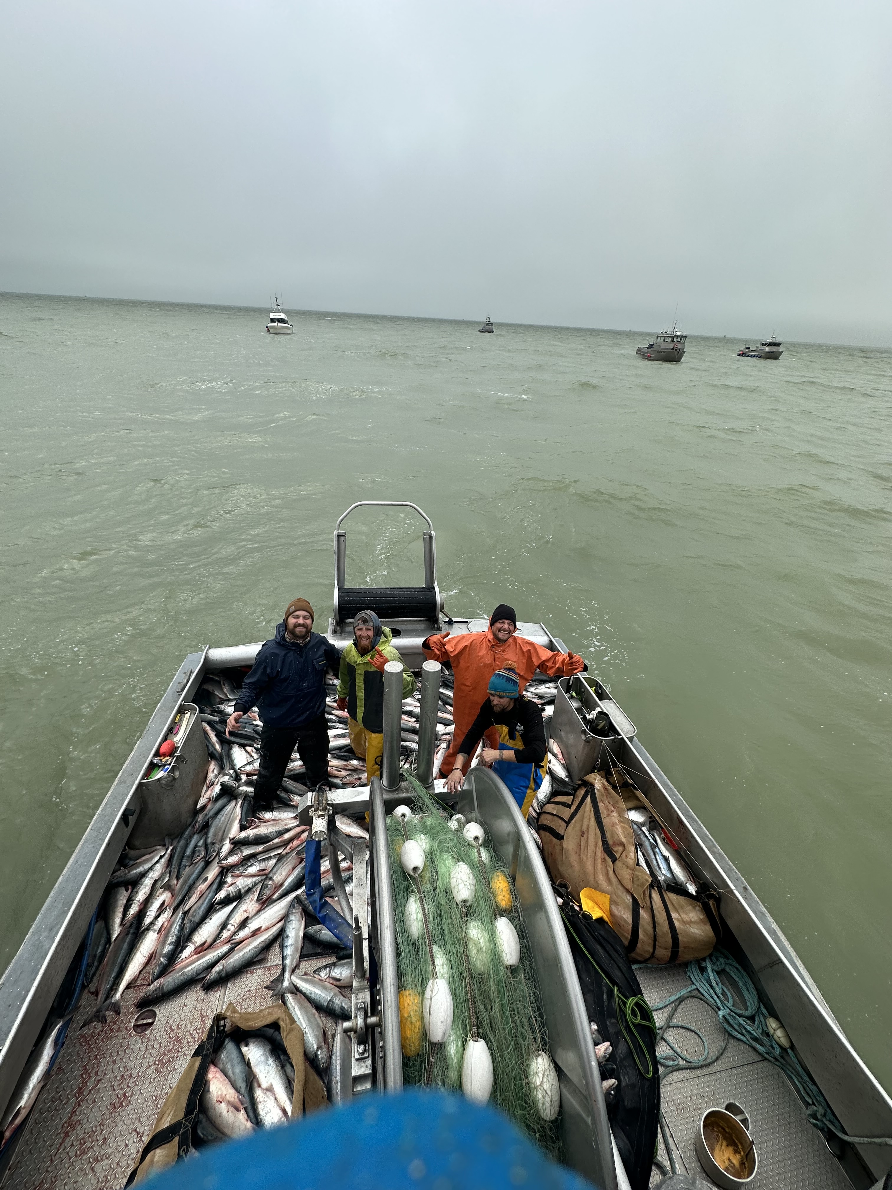 Thankfully the new transmission performed perfectly, and we got back to fishing immediately. It seemed like we were launching into waters thick with salmon! Everyone was catching full nets of reds right outside the river mouth. We only had an hour to fish before the period was over, so we went at breakneck speed to get fish on the boat. We wound up with a couple thousand pounds in a hour, which was really good. It seemed like we were in the right part of the bay for fishing! The next period we crushed it. Full net after full net came up. Sometimes we would not pick the fish fast enough for the skipper’s liking, so he’d have us do a thing called ‘roundhauling’ at the end of certain sets. When you roundhaul, you pull in the net full of fish in by hand as fast as you can. You just make a big pile of net and salmon on the deck. By the end you’re usually flat on your back, covered in fish. It’s not a fun thing to have to do, as it makes it really hard to get all the fish out of the net since it’s tangled up all over the place. We did that a few times during this fishing period, it takes a lot out of you to do.