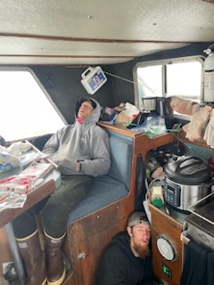 We made our final offload and took on enough fuel to make the voyage back north. As we pulled away from the tender, the skipper noticed that the boat wasn’t running the way it should. When we checked below decks to see what was going on down there, we were shocked to discover that the hull was full of water! We were halfway sunk! Immediately we turned around and limped back to the tender. We appealed to the crew to help us out, and they let us borrow one of their pumps. Using that pump and our bilges, we soon got all the water pumped out. It had been a close call. If we would have discovered our leak in transit, miles away from help, we might not have been able to get all that water out in time. It shook us all up, in particular Bruno was freaked out pretty good. He had been on a crab boat that had sank out on the Bering Sea back in 2016 where a couple guys drowned. Seeing all that water in the boat brought back a lot of bad memories for him.