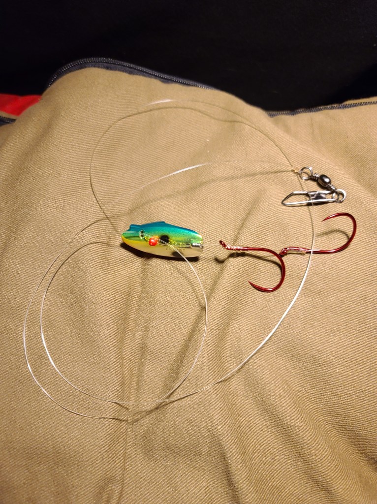I left the mountain around six, but by the time I drove to HMB, ate breakfast and hit up the bait shop, it was around 9 when I got to the jetty. I had brought my medium-size rod and reel shore combo to fish with this day which consisted of my 10 and 1/2 foot Shimano Talora medium-light shore casting rod with my Shimano Curado baitcasting reel. I’ve got 30 lb green Power Pro braid on the reel, and a shock leader made from 50 lb monofilament. This is my go-to setup for casting jigs from shore. Shimano makes some fine gear, I really love this combo. That coupled with some swimbaits makes for a great rig to catch whatever may be swimming out there off the rocks or beach.