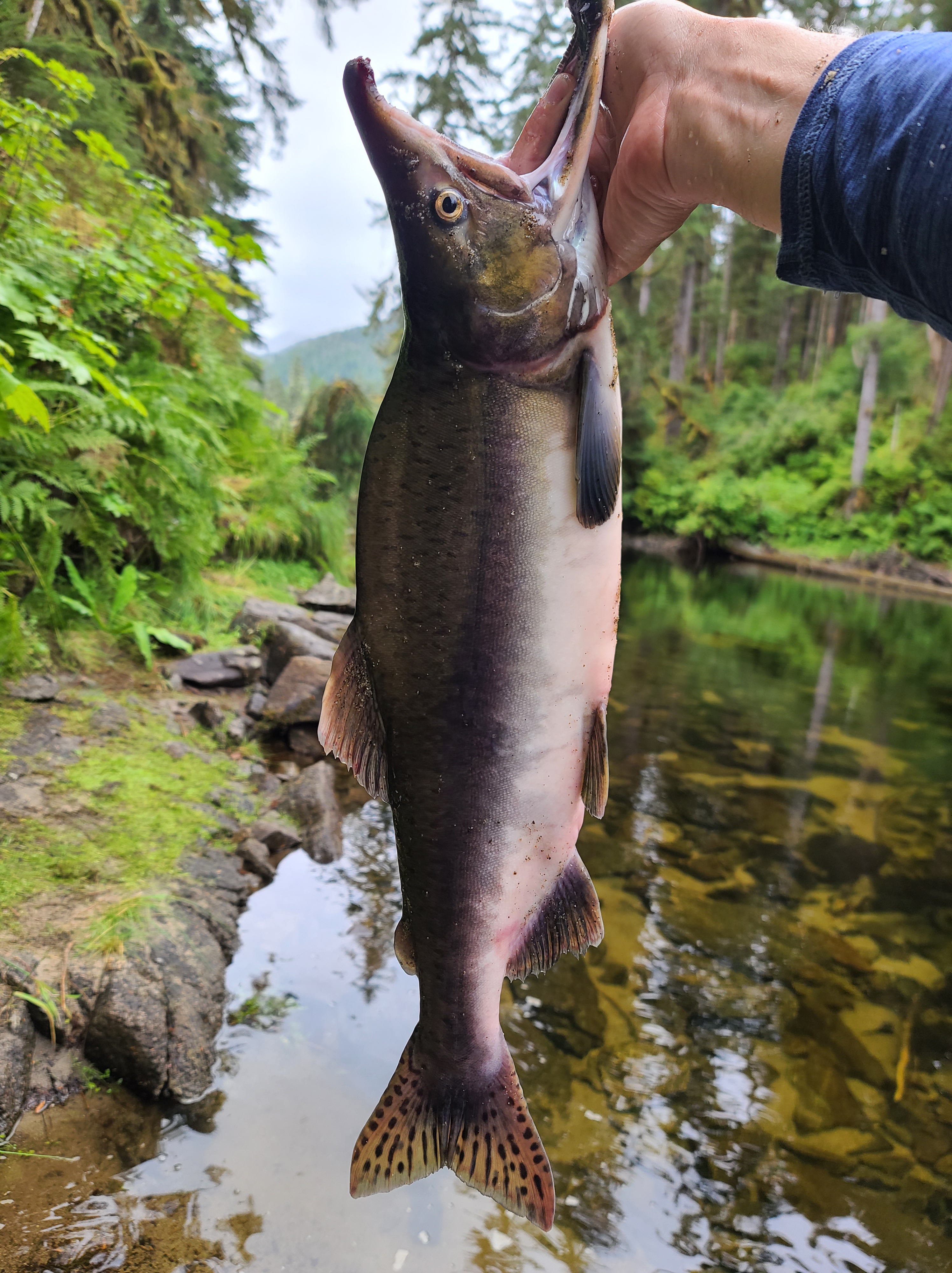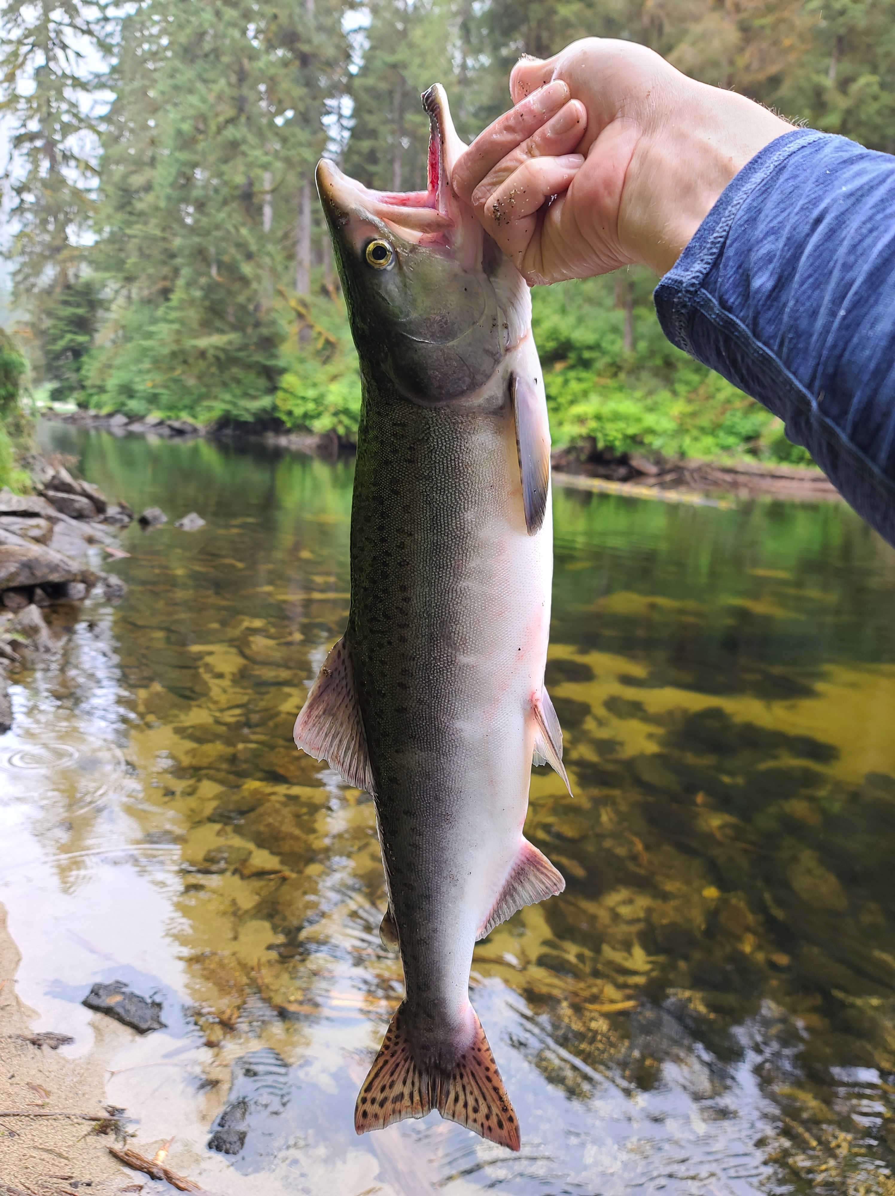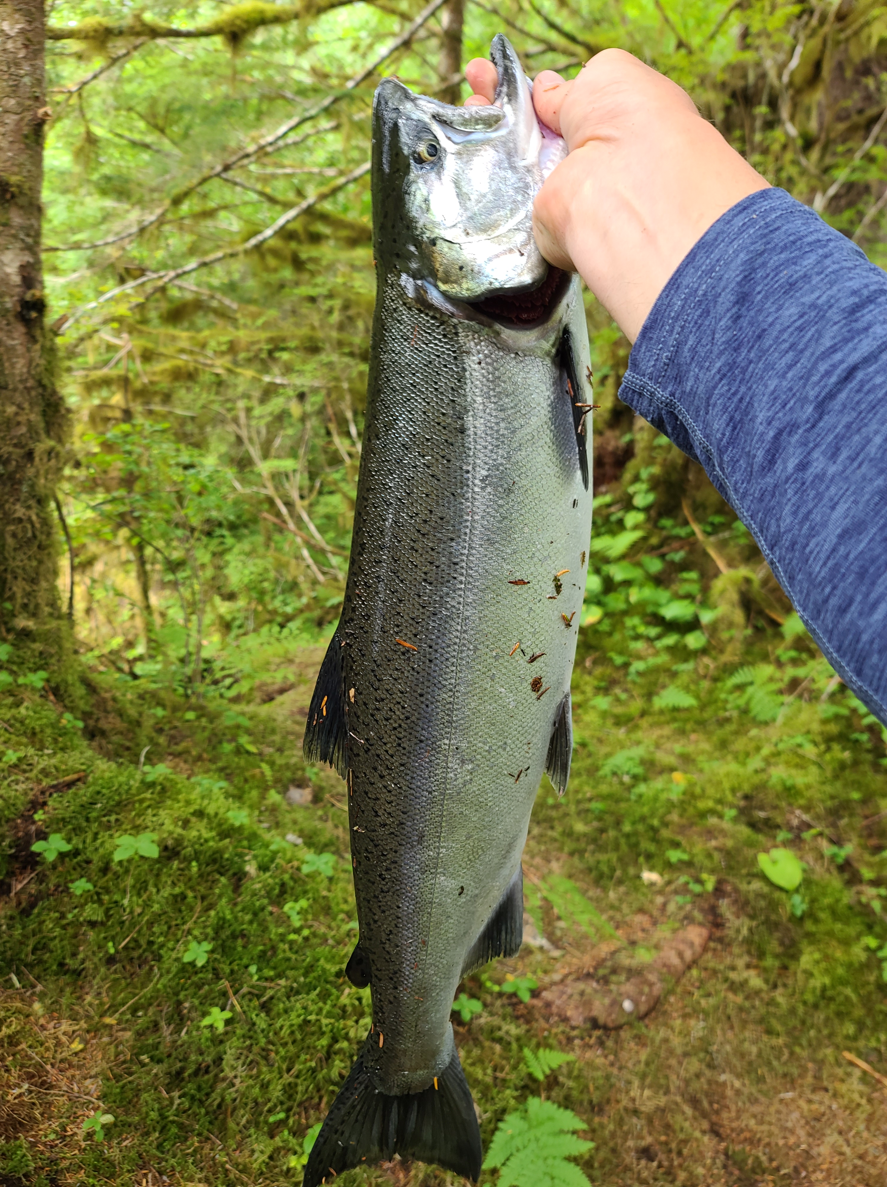 When I got back to the lodge and told people my story, I got a lot of sympathy. There’s been a lot of loss and destruction of my co-worker’s fishing gear on the creek & trail. As to theories of what grabbed my missing fish, people suggested mink, bears or Sasquatch as some possible culprits. I only had my back turned to the spot where my fish were at briefly when I went up and down the bank trying to free the snag. My theory is that the resident bald eagle swooped down and snatched it. I would have thought I’d have seen something so large come down and grab it, but I wouldn’t have put it past him to do so! I’m sure he had his eye on me the whole time I was there, just waiting for his opportunity. They are smart like that.