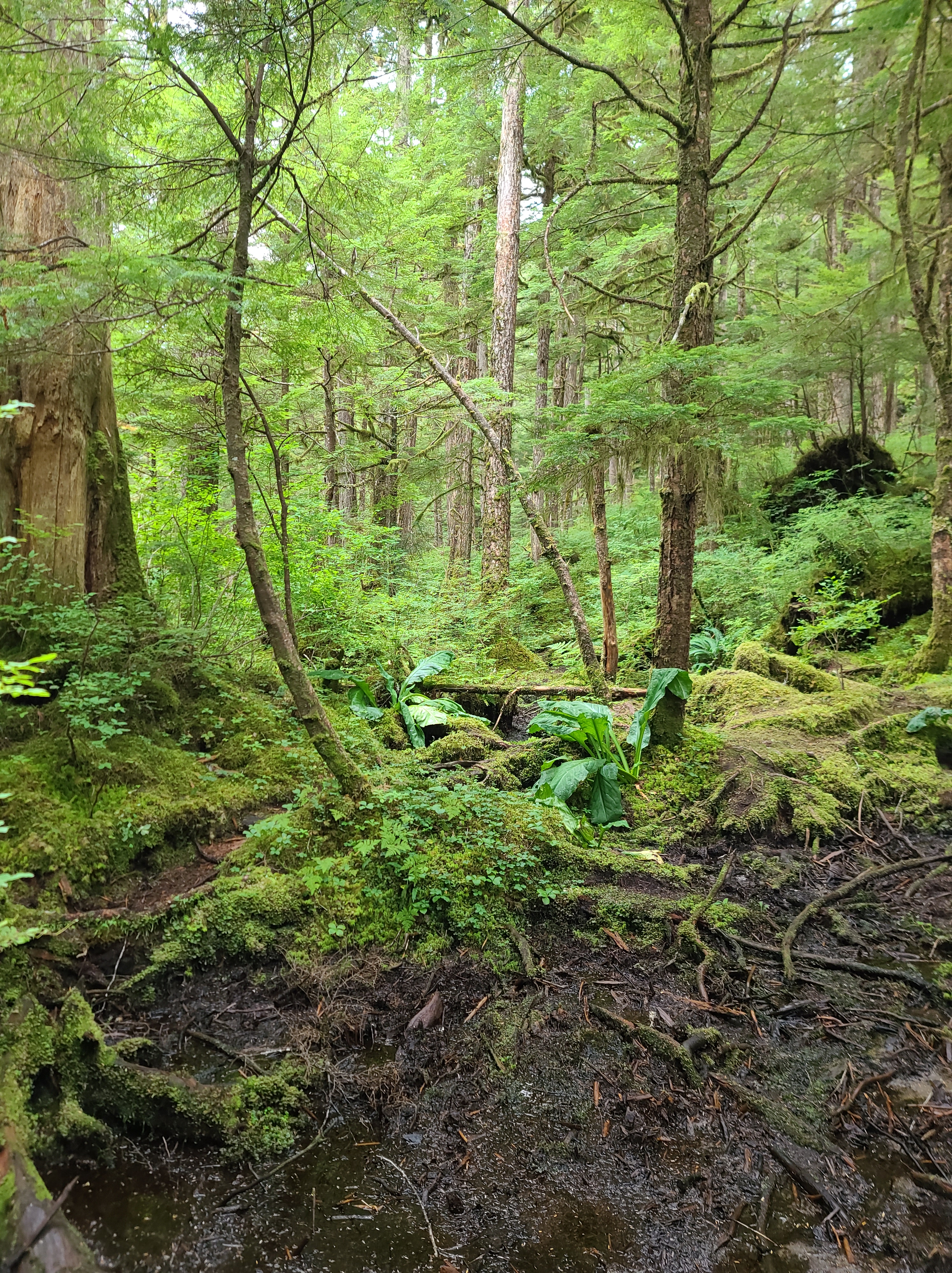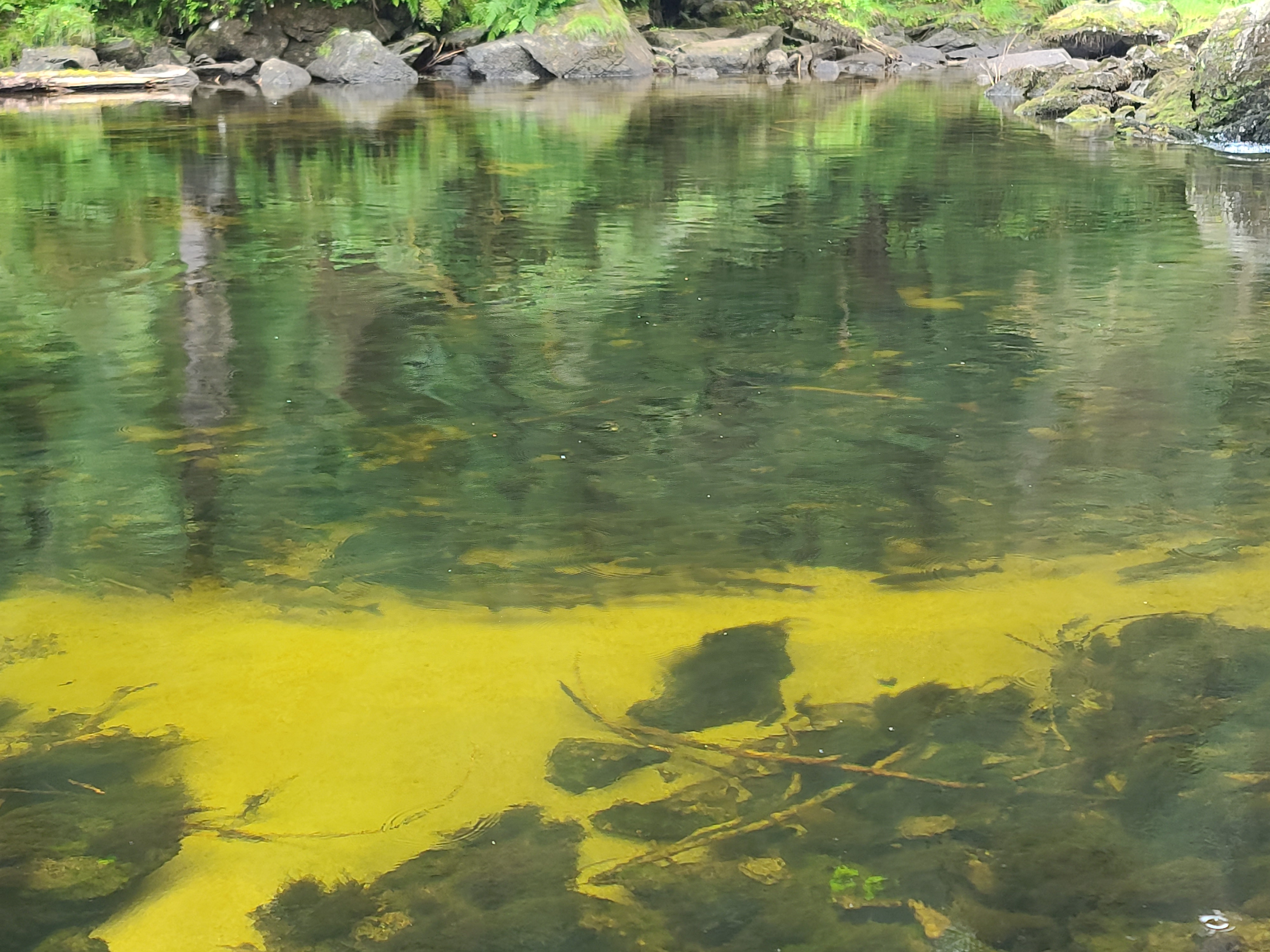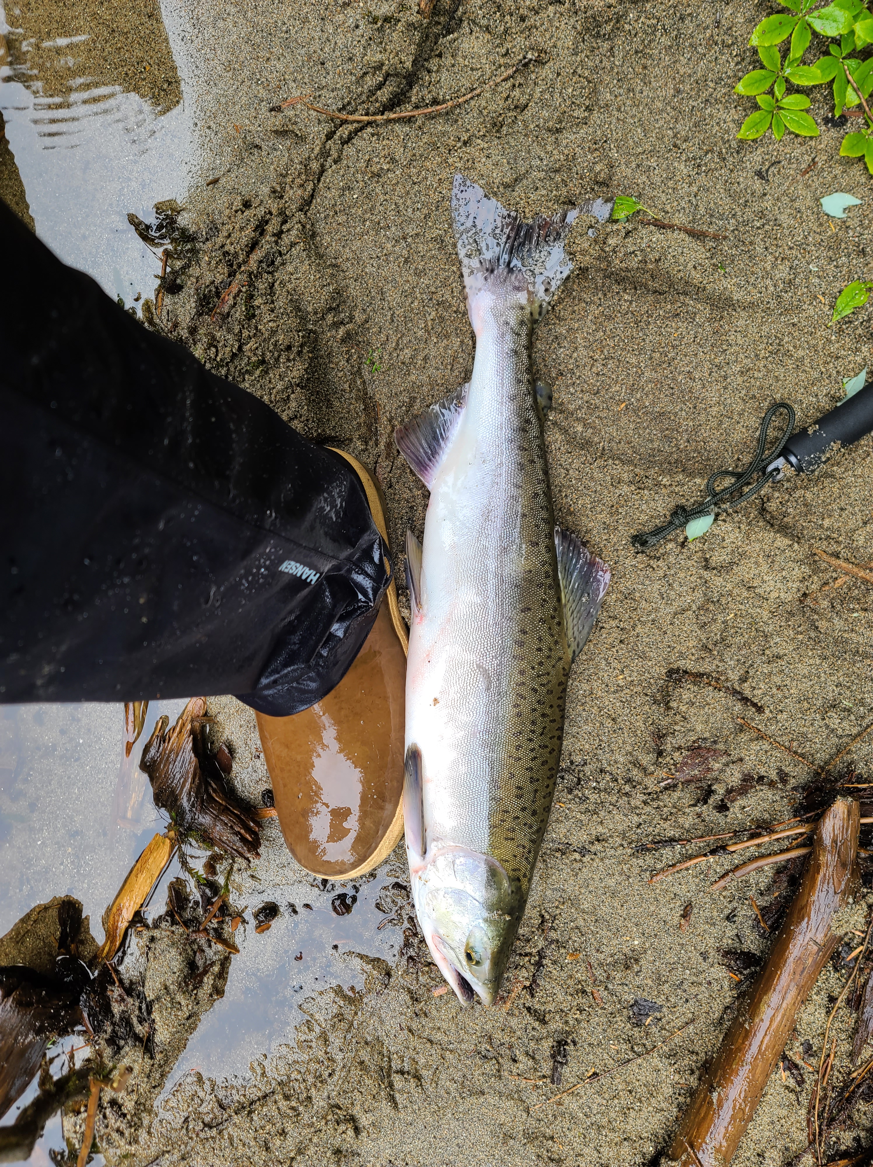 When I got back to the lodge and told people my story, I got a lot of sympathy. There’s been a lot of loss and destruction of my co-worker’s fishing gear on the creek & trail. As to theories of what grabbed my missing fish, people suggested mink, bears or Sasquatch as some possible culprits. I only had my back turned to the spot where my fish were at briefly when I went up and down the bank trying to free the snag. My theory is that the resident bald eagle swooped down and snatched it. I would have thought I’d have seen something so large come down and grab it, but I wouldn’t have put it past him to do so! I’m sure he had his eye on me the whole time I was there, just waiting for his opportunity. They are smart like that.
