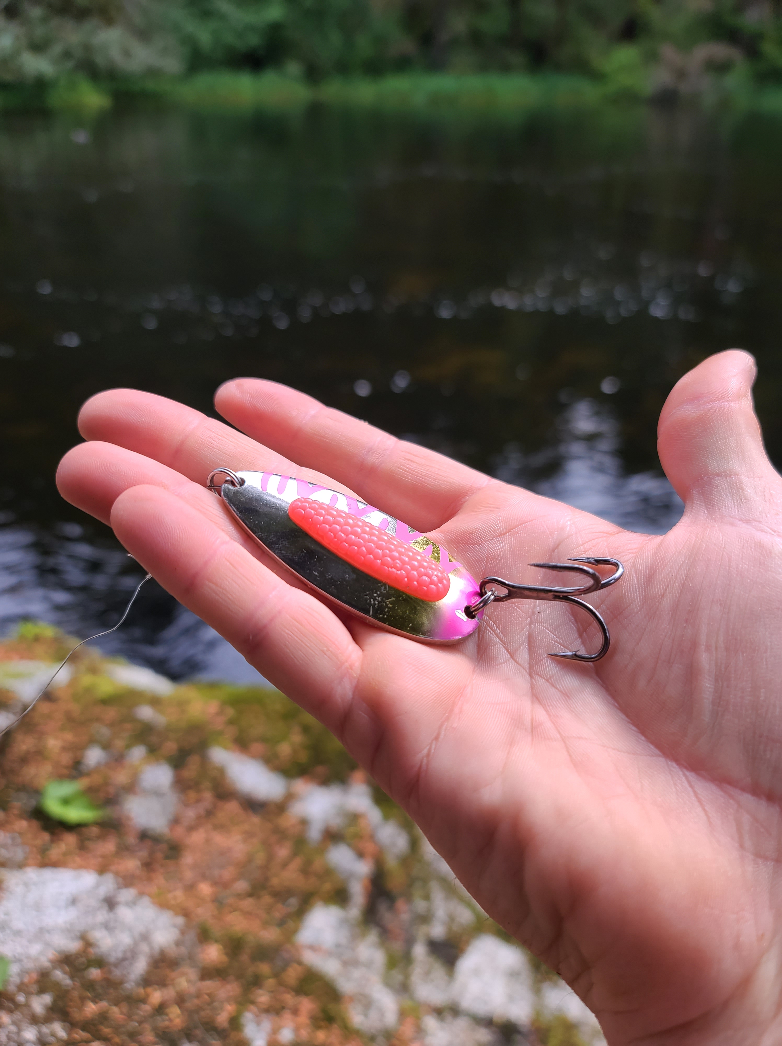 I began to cast and started getting snagged almost immediately. It’s a tricky spot to fish. You have to use a heavy 1 oz spoon to get it down to depth quickly as the current flows pretty rapidly there. The stream goes from a depth of two feet down into a 15 foot hole. First, you have to cast upstream where it’s shallow, then keep your rod tip up to keep from snagging until it gets over the hole. Then you dip your lure down, drift it through the hole and out the other side. If you do it correctly, you’re bound to hook one of the big salmon down there in the trench.