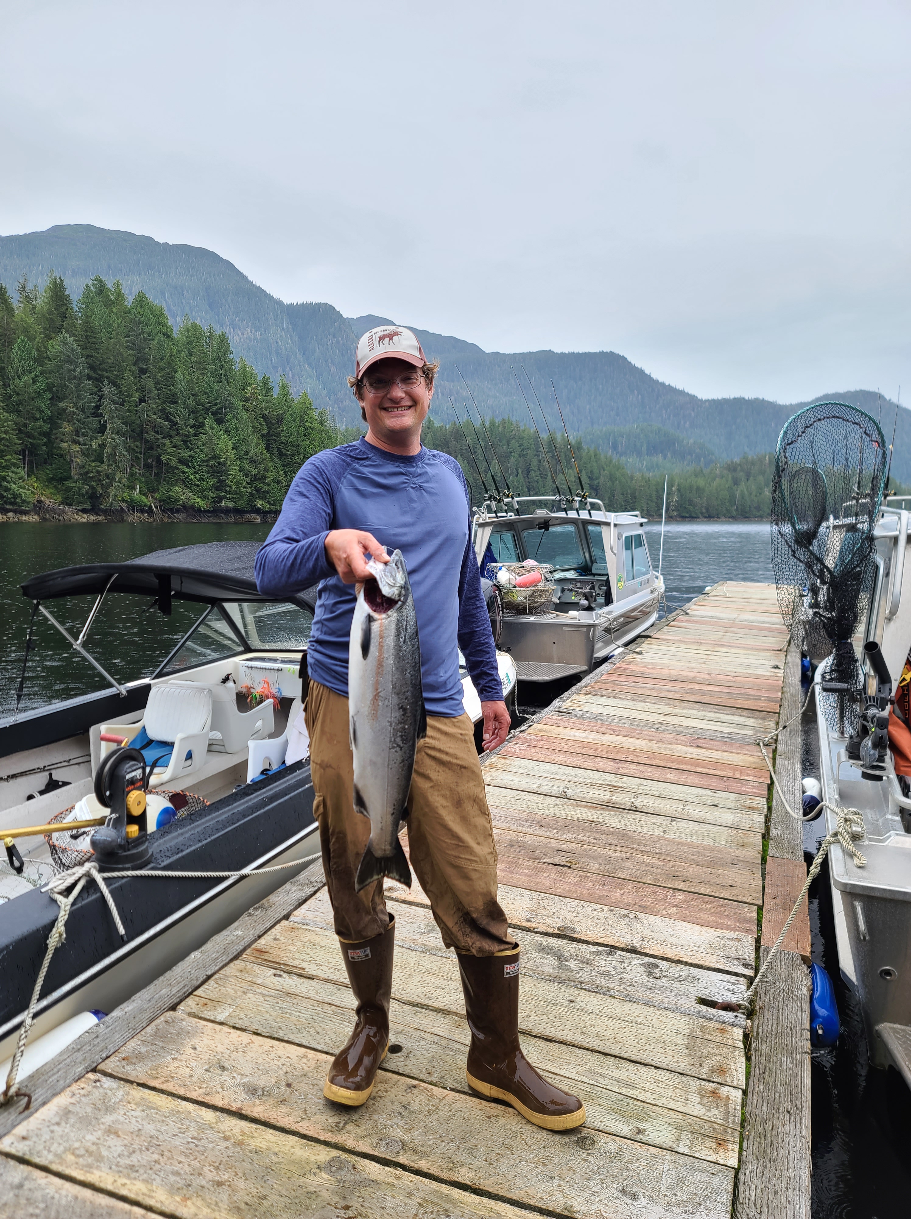 In reference to the title of this post, the creek had its vengeance on me this week in another example of “Alaska Giveth, Alaska Taketh Away.” For my day off this week, I decided to go fish the spot called ‘S-Turn’. You’ll recall that’s the spot I fished the first time I went up the creek. Earlier in the day Gabe (our chef) and myself fished at the mouth of the creek by the lodge where it empties into the bay. Sockeye salmon have started to be caught there and we wanted to try for those. Also, Captain Jimmy was planning to go out fishing for salmon sharks the next day and had put in a request for pink salmon to use for chum & shark bait. We wanted to help out with that if we could.